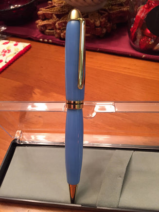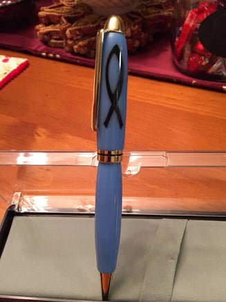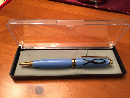 This is an acrylic style pen I turned on the lathe. The top portion has an embedded Christian Fish symbol. The clip, band, and tip are gold plated. the pen comes with the case that is pictured. Would make a great gift.